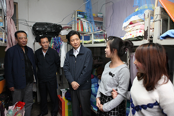 在学生第一餐厅,薛义忠书记径直走到售饭窗口,了解餐厅的经营模式、菜品种类、质量、价格、食堂开放时间等基本情况。他还驻足于餐桌前,与正在就餐的学生亲切交流,询问大家对饭菜的感受和评价,听取大家对饮食工作的意见和建议。薛书记对陪同察看的同志说,后勤工作一定要以人为本,心系广大师生,特别是广大学生,切实关心学生的生活,及早解决学生的住宿、饮食、洗浴等方方面面的困难和问题,要把工作做细、做实,为学生提供优质的服务。检查过程中,后勤集团总经理台世强还就餐厅建设、基本设施配备等问题向薛书记进行了汇报。